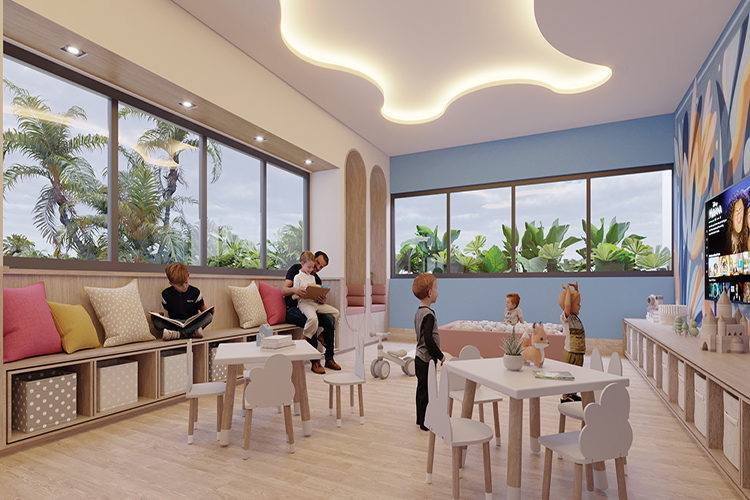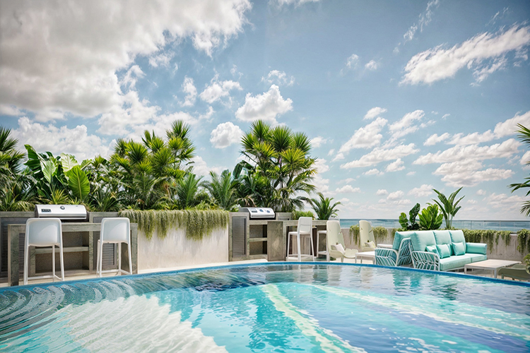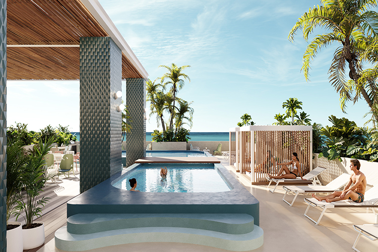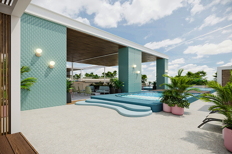 un rooftop avec vue imprenable sur l’océan, plusieurs piscines avec bar aquatique, espaces lounge, jacuzzi, spa, sauna, zones familiales, club pour enfants, espace de co-working avec salles de réunion, zone pour animaux, buanderie, parking souterrain, espaces commerciaux, sécurité 24h/24, et bien plus encore.